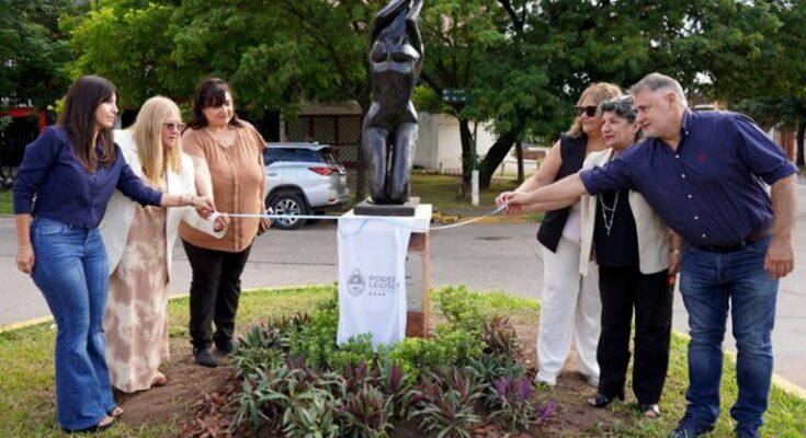 Frente a la escultura donada por la Comisión Provincial Multisectorial de la Mujer, se descubrió una placa conmemorativa que sirve como recordatorio permanente de las mujeres que perdieron la vida a causa de la violencia.