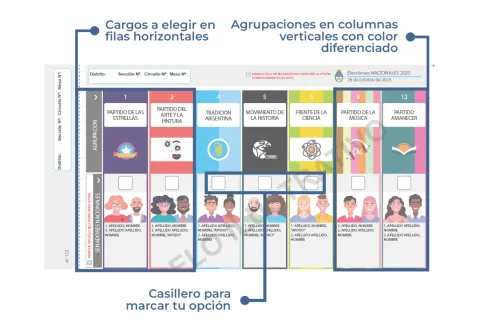 La BUP está dividida en espacios horizontales para cada una de las categorías de cargos electivos y en columnas verticales para cada agrupación política que cuente con listas oficializadas.