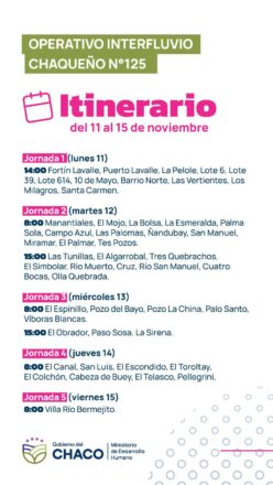 El Gobierno de la provincia del Chaco tiene una agenda cargada de actividades para este martes 12 de noviembre, con diversos eventos que abarcan desde jornadas de regularización dominial hasta operativos en el Impenetrable. A continuación, se detallan las principales actividades programadas: