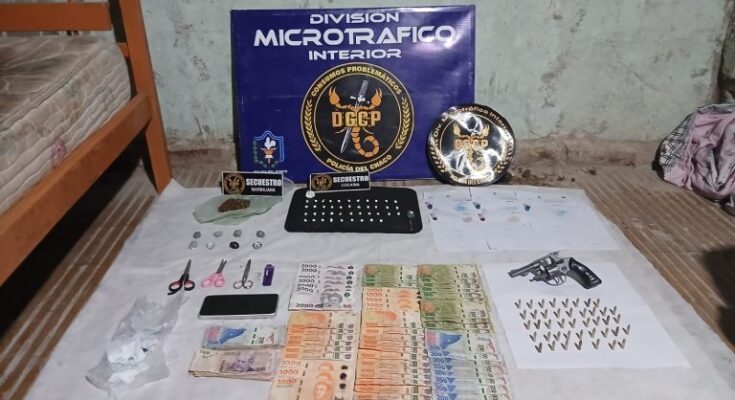 Durante el procedimiento secuestraron 11,8 gramos de cocaína y 33,7 gramos de marihuana, fraccionadas en distintos envoltorios, además de elementos utilizados para el corte y distribución, un teléfono celular y 56.100 pesos en efectivo.