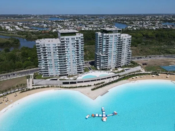 Además, el complejo ofrece seguridad privada las 24 horas y acceso exclusivo a una playa de arnea con una laguna artificial de 20.000 metros cuadrados, áreas de esparcimiento y un sector deportivo con canchas de fútbol y tenis.