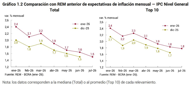 Acá podemos ver las expectativas del REM, ya sea el total (gráfico de la izquierda) como del top 10 (gráfico de la derecha). Y se sigue esperando que la inflación continúe a la baja, a pesar de los rebotes de los últimos meses.