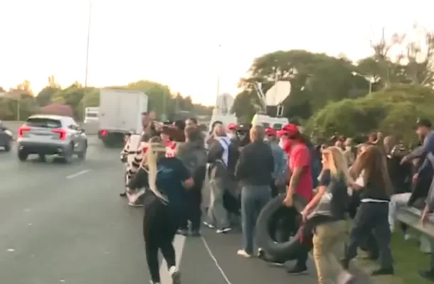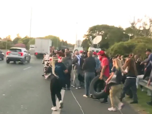 Los empleados de la histórica fábrica de neumáticos argentina se manifiestan sobre la autopista.