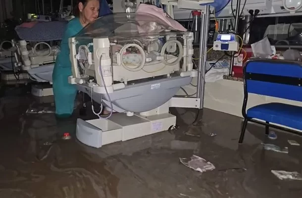 Gran parte del centro de salud quedó inundada por el fuerte temporal y los médicos debieron evacuar a los bebés recién nacidos.