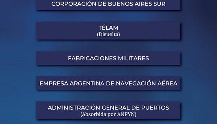Las empresas afectadas son: Corporación Buenos Aires Sur; Fabricaciones Militares; Empresa Argentina de Navegación Aérea (EANA); Administración General de Puertos (AGP), que fue “absorbida por la Administración Nacional de Puertos y Navegación” (ANPYN); y Télam, que fue “disuelta”.