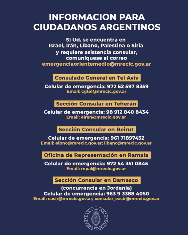 Al mismo tiempo, brindaba una serie de contactos telefónicos y por correo electrónico “de nuestras representaciones consulares en Tel Aviv, Teherán, Beirut, Ramala y Damasco para asistir a los connacionales que ya se encuentren en la zona”.