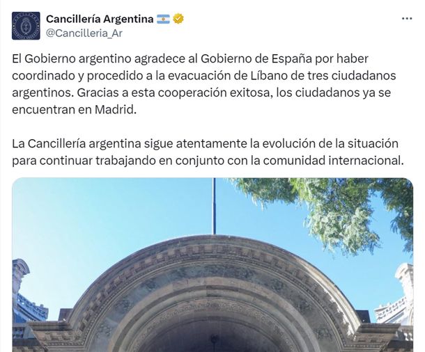 “El Gobierno argentino agradece al gobierno de España por haber coordinado y procedido a la evacuación de Líbano de tres ciudadanos argentinos. Gracias a esta cooperación exitosa, los ciudadanos ya se encuentran en Madrid”, dice el escueto comunicado oficial.