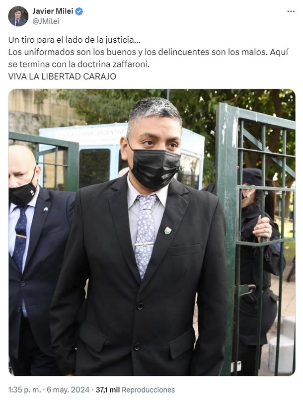 De hecho, el expolicía fue condenado durante el mandato de Alberto Fernández pero apenas se conoció la noticia de que se había declarado nulo el juicio Javier Milei celebró en redes sociales diciendo que era «un tiro para el lado de la justicia».
