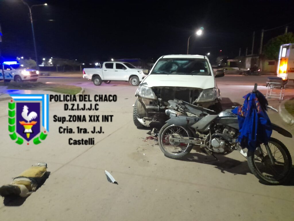 El lamentable hecho ocurrió esta madrugada en la intersección de la avenida Güemes y calle Holzer de la ciudad de Juan José Castelli, ente una camioneta y una motocicleta resultados dos masculinos heridos , atendidos en el hospital bicentenario y luego trasladado al Hospital 4 de junio de Presidencia Roque Sáenz Peña, luego de la intervención quirúrgica fue trasladado de regreso a Castelli.-