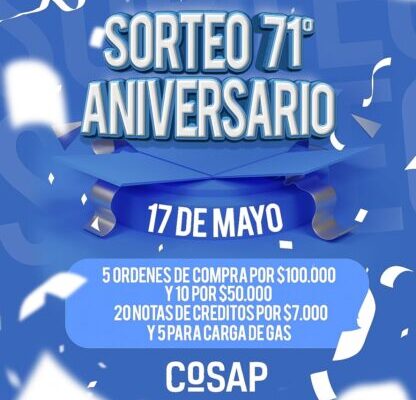 El próximo 17 de mayo la CoSAP “Cooperativa de Servicios Antonio Portillo Ltda”, invita a festejar juntos los 71 años de la institución, con importantes premios”