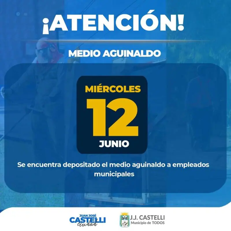 El Ejecutivo Municipal de Juan José Castelli, anunció que desde este miércoles 12 de junio se encuentra habilitdo el pago del medio aguinaldo año 2024 desde la administración contable.