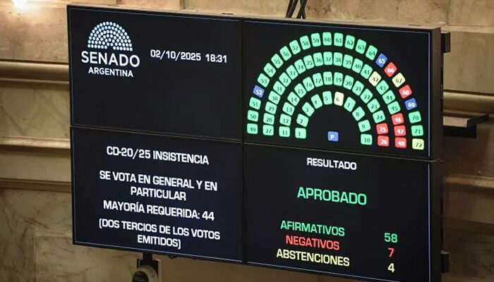 Con la presencia de una masiva marcha universitaria en las afueras del Palacio Legislativo, el Senado aprobó la insistencia definitiva de la Ley de Financiamiento Universitario con 58 votos afirmativos, 7 negativos y 4 abstenciones. El Gobierno nacional queda obligado a promulgar la ley ya que el texto superó ampliamente los dos tercios que establece la Constitución Nacional.