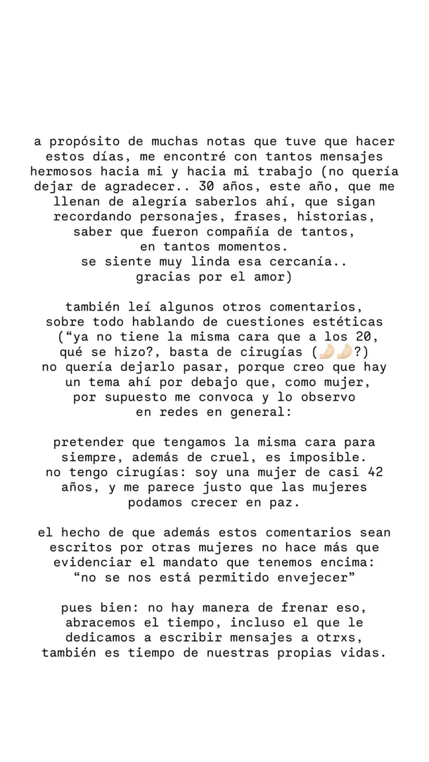 La actriz agradeció primero los mensajes positivos de sus seguidores. «A propósito de las muchas notas que tuve que hacer estos días, me encontré con tantos mensajes hermosos hacia mí y mi trabajo que no quería dejar de agradecer. 30 años, este año, me llenan de alegría saberlos ahí, que sigan recordando personajes, frases, historias, y saber que fui compañía en tantos momentos”, escribió, y agregó: “Se siente muy linda esa cercanía… gracias por el amor”.