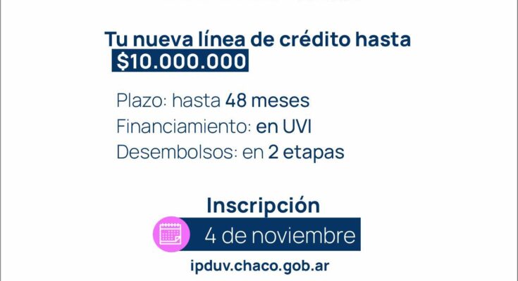 La línea contará con tres modalidades: una de cuatro millones, otra de siete millones y una tercera de diez millones. La inscripción para acceder a estos créditos comenzará el 4 de noviembre y se extenderá hasta el 25 del mismo mes. Es importante señalar que el proceso se realizará exclusivamente en ipduv.chaco.gob.ar, sin atención presencial, mientras que toda la información de la operatoria será cargada en dicho sitio como también en las redes sociales del organismo.