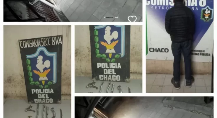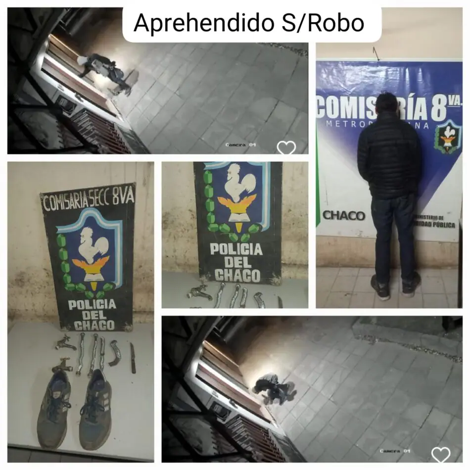 Alrededor de la 01:00, los agentes de la Comisaría Octava, tras realizar tareas investigativas, identificaron al sujeto capturado en el video. Durante un patrullaje en el Pasaje Reggiardo al 1030, el personal procedió a la demora del hombre, quien llevaba consigo una bolsa de nailon blanca que contenía tres flexibles de metal tipo bronce pintado cromado, dos canillas de bronce, un cuchillo Tramontina, unas zapatillas Adidas y un pantalón jeans, las mismas prendas utilizadas al momento del robo.