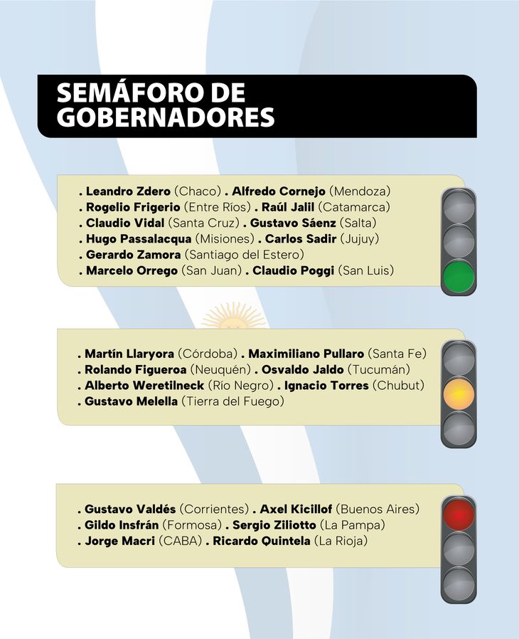 Mientras que en rojo alumbran, entre otros, a Gustavo Valdés (Corrientes), Axel Kicillof (Buenos Aires), Gildo Insfrán (Formosa) y Sergio Ziliotto (La Pampa). En este tramo del semáforo también podrían encontrarse Jorge Macri (CABA), así como también Ricardo Quintela (La Rioja).