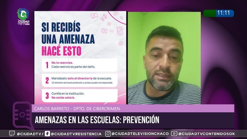 El jefe de la División de Cibercrimen de la Policía del Chaco, Carlos Barreto, explicó cómo se investiga la circulación de amenazas en escuelas y advirtió que estos hechos pueden constituir delitos. Señaló que la policía trabaja con protocolos de intervención junto al sistema de emergencias y remarcó la importancia de que estudiantes y familias eviten viralizar mensajes intimidatorios en redes sociales.