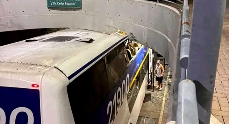Según testigos, el colectivo habría impactado contra la estructura del puente tras una salida confusa del operativo policial. La unidad quedó incrustada bajo el paso, con severos destrozos en su parte superior.