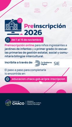 El Ministerio de Educación del Chaco informa a las familias que del 1 al 15 de noviembre de 2025 estará abierta la preinscripción para el Ciclo Lectivo 2026, destinada a los niños/as que ingresan a Nivel Inicial (Jardín) o Primer Grado de Educación Primaria.