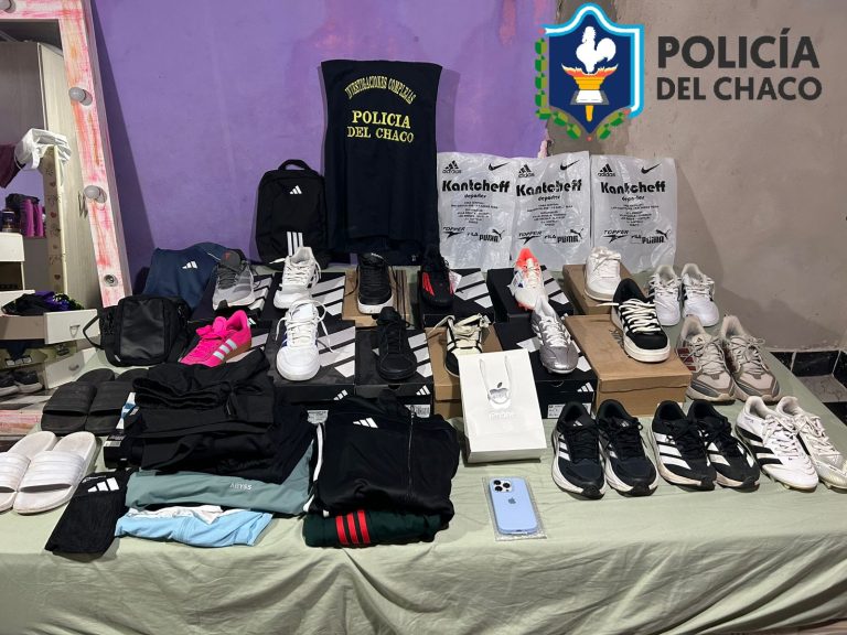 Con orden judicial, se llevó adelante un allanamiento donde se procedió a la aprehensión del sospechoso y al secuestro de numerosos elementos vinculados a la causa, entre ellos 19 pares de zapatillas y botines, 15 conjuntos deportivos, un teléfono celular iPhone 14 Pro Max, la suma de $2.420.000 en efectivo y un automóvil Toyota Corolla.