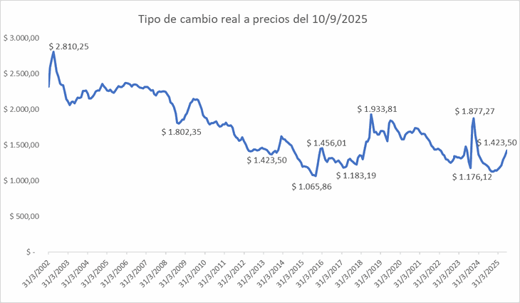 Sin embargo, el dólar hoy permanece un 17,4% por debajo del promedio de la post convertibilidad que, a precios actuales, es de aproximadamente $1.724. Desde el fin del «uno a uno», se pueden identificar dos períodos de algunos meses con un precio del dólar similar al de hoy: el que va de mayo de 2012 a mayo de 2013 ($1.437), y el que va de diciembre de 2021 a abril de 2022 ($1.435).