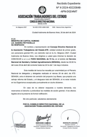 La medida surge a partir del dictamen de mayoría al proyecto de Ley Bases, firmado este jueves en la Cámara de Diputados, el cual propicia una dura reforma del Estado que deteriorará notablemente el funcionamiento de organismos estatales, incluido el SENASA. Por eso, el 30 de abril ATE se movilizará frente al Congreso en una nueva Jornada Nacional de Lucha en el marco del Frente de Sindicatos Estatales y Gremios de Empresas Públicas, fecha en la que se estará tratando el proyecto en el recinto parlamentario.