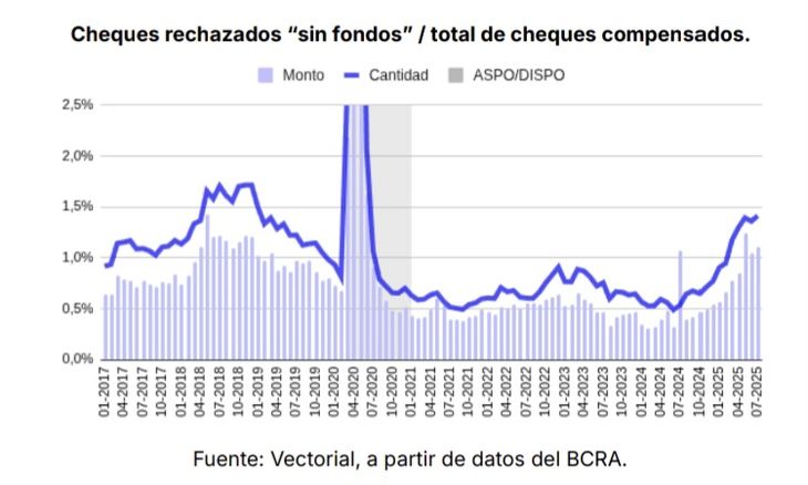 La consultora también enciende alertas sobre el costado financiero: los cheques rechazados por falta de fondos ya se acercan a los niveles críticos del gobierno de Mauricio Macri, mientras que el apretón monetario vía encajes bancarios disparó las tasas de adelantos en cuenta corriente y de descuento de cheques. La consecuencia probable: más tensiones en la cadena de pagos.