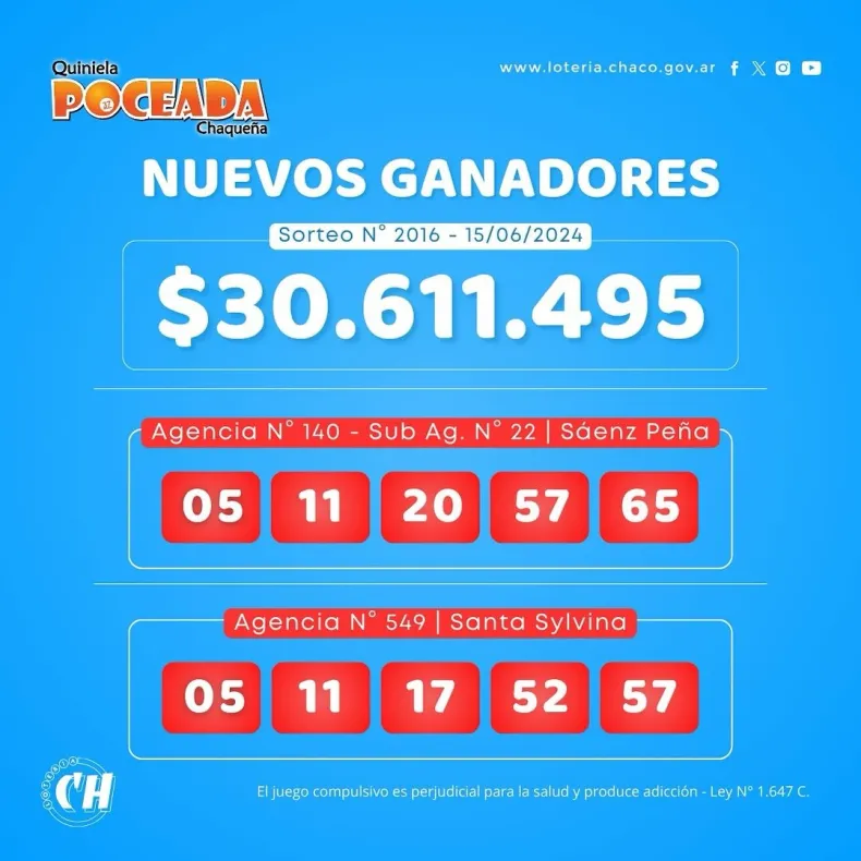 Se trató del sorteo número 2016 de la Poceada Chaqueña del sábado 15 de junio y en esta ocasión los ganadores recibieron un total de $ 30.611.495 cada uno.
