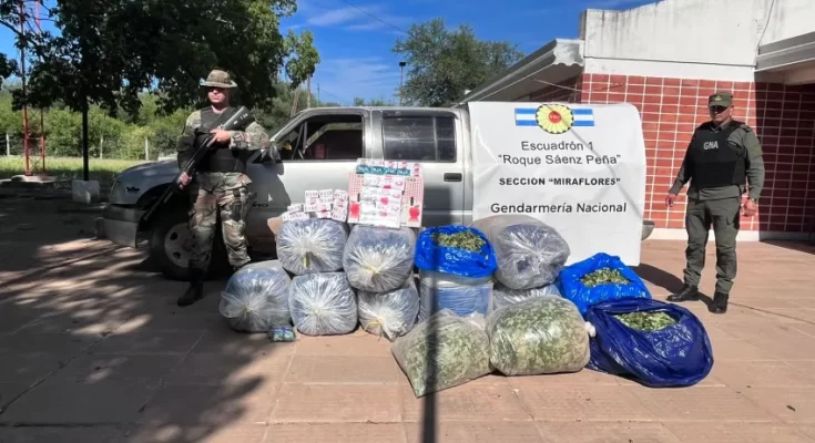 Personal de Gendarmería Nacional incautó 196 kilos de la sustancia vegetal y 28 atados de cigarrillos, tras un control en las rutas 67 y 13.