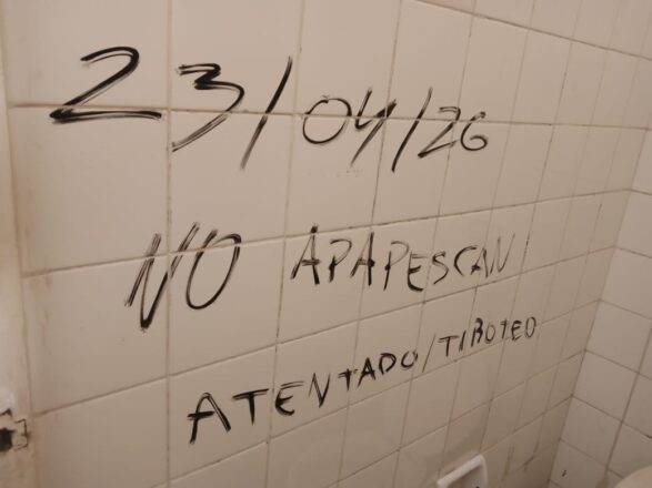 En la tarde de ayer, la directora de la Escuela Secundaria Técnica N°22 de Sáenz Peña denunció que un alumno se topó con un mensaje en el baño de varones que alertaba sobre un presunto tiroteo el 26 de abril. Los agentes de la Comisaría Primera tomaron el caso, hablaron con docentes, directivos y alumnos. Un chico de primer año fue señalado como el sospechoso después de haber entrado al aula diciendo que “se iba a armar una tiroteada”, pero confesó que solo fue un chiste y que no había escrito el mensaje en la pared del baño. Por lo pronto, los agentes borraron el mensaje de la pared y prosiguen con la investigación para saber qué alumno fue el responsable.