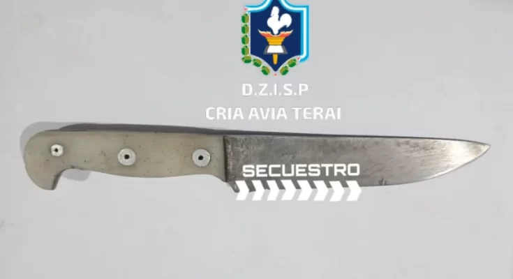 En poder del mismo, se secuestró un arma blanca tipo cuchillo de aproximadamente 25 centímetros de largo total, con 15 centímetros de hoja y 10 centímetros de mango, blanco.