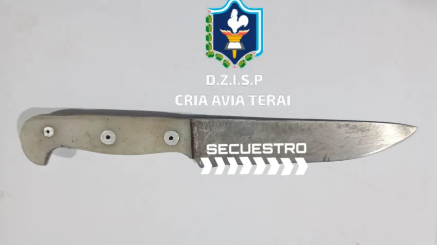 En poder del mismo, se secuestró un arma blanca tipo cuchillo de aproximadamente 25 centímetros de largo total, con 15 centímetros de hoja y 10 centímetros de mango, blanco.