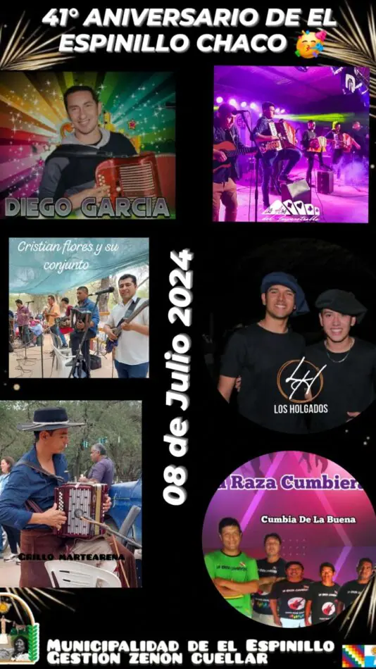 El próximo 8 de julio de 2024, la localidad de El Espinillo se vestirá de fiesta para celebrar su cuadragésimo primer aniversario con una serie de actividades y un espectacular festival folclórico. Desde temprano, la comunidad se congregará en diversas actividades que culminarán en un evento musical sin precedentes.