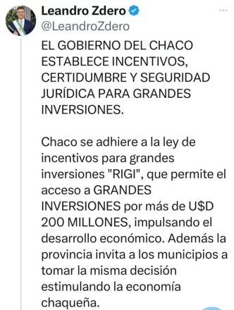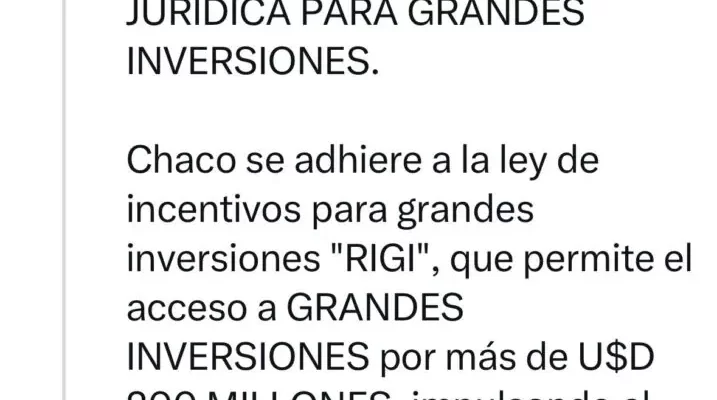 Chaco se adhiere a la ley de incentivos para grandes inversiones «RIGI», que permite el acceso a GRANDES INVERSIONES por más de U$D 200 MILLONES, impulsando el desarrollo económico. Además la provincia invita a los municipios a tomar la misma decisión estimulando la economía chaqueña.