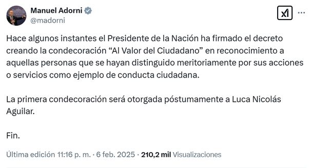 Acto seguido, en el Decreto 65/2025 se otorgó la primera condecoración a Lucas Nicolás Aguilar. Al respecto, en el artículo 2° se aclaró que “en virtud del fallecimiento del condecorado, se hará entrega de la medalla a su familiar más cercano, de conformidad con lo dispuesto por el artículo 3° del Decreto N° 64 del 6 de febrero de 2025″.