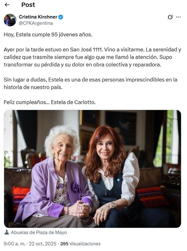 Por su parte, el exsecretario de Derechos Humanos y nieto recuperado Horacio Pietragalla Corti, publicó: «Nuestra presidenta de abuelas de Plaza de Mayo hoy cumple un año más de lucha y de ejemplo. Te quiero, Estela, y gracias por devolvernos la posibilidad de saber nuestra historia».
