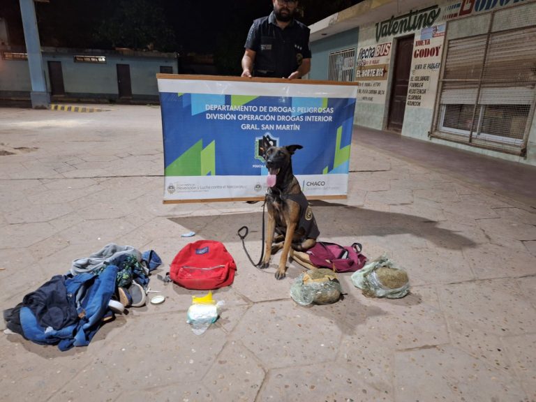 Es así, que mediante el olfato del can, los agentes secuestraron 400 gramos de cocaína, 2.137 gramos de marihuana, un celular y 750 pesos a un ciudadano que se destinaba hacia la ciudad de Resistencia.
