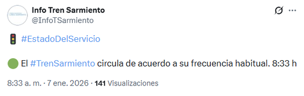 Desde Trenes Argentinos especificaron que, pasadas las 8, las formaciones del Tren Sarmiento volvían a detenerse en la estación Liniers luego de la colisión, aunque el servicio circulaba con algunas demoras. Poco después, la frecuencia se restableció a sus horarios habituales.