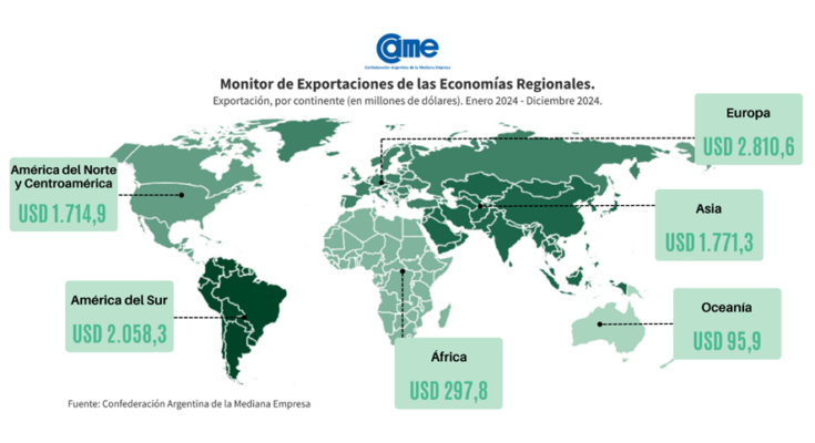 Con este incremento, las exportaciones regionales alcanzaron los USD 8.749 millones exportados en el período enero 2024 – diciembre 2024, habiendo importado USD 2.004 millones, lo que arroja un superávit comercial de USD 6.745 millones.