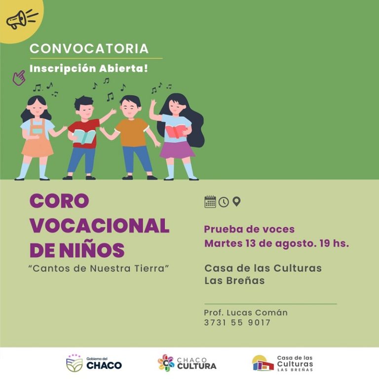La Casa de las Culturas Las Breñas, dependiente del Instituto de Cultura del Chaco, informa que hasta el martes 13 de agosto hay tiempo para formar parte del coro de niños. La participación es libre y gratuita.