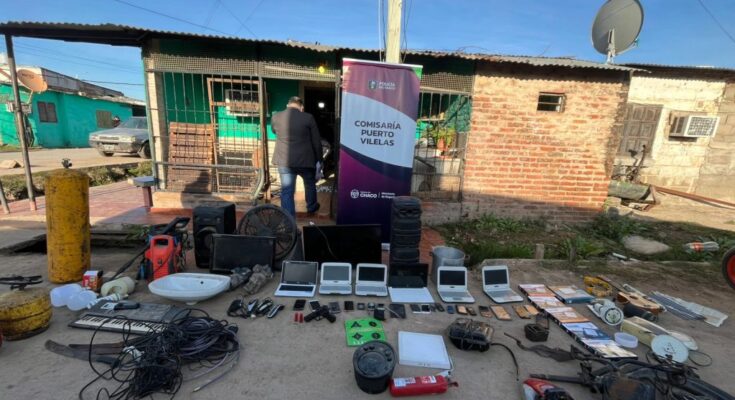 En el primer domicilio, secuestraron dos cartuchos calibre 12/70, uno calibre 22, una réplica de arma de fuego con su respectivo cargador, cinco netbook de gobierno, una notebook, cuatro máquinas de cortar cabello, dos hidrolavadoras, dos parlantes musicales, dos televisores, dos bombas presurizadoras, tres cámaras digitales, doce teléfonos celulares, dos tablets, seis reflectores, cuatro focos de alumbrado público, un ventilador de pie, una olla de aluminio de 20 litros, un órgano musical marca Yamaha, dos piletas de cerámica, motopartes, once tarjetas de débito, ocho cedulas de motocicletas, siete documentos de identidad, tres machetes, tres tubos de gas, y $1.035.700 discriminados en varios billetes.