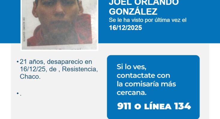 La Policía del Chaco en base a una denuncia registrada en Comisaria Primera Fontana, solicita a la comunidad su valiosa colaboración de informar a la unidad policial más cercana cualquier información relacionada al paradero de JOEL ORLANDO GONZÁLEZ, de 21 años, de 1,68 metros de altura, de contextura física delgada, tez trigueña, cabello castaño claro, ojos color marrones. Se le ha visto por última vez en fecha 16/12/2025.