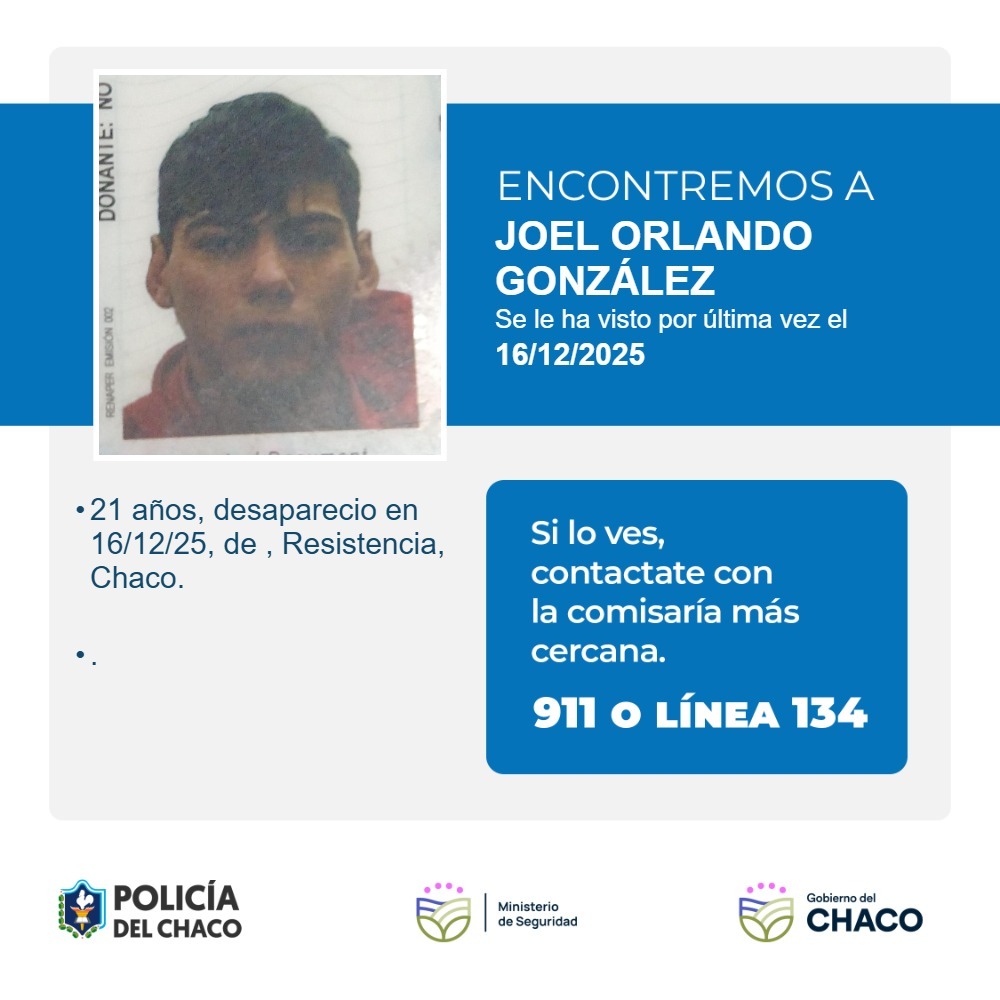 La Policía del Chaco en base a una denuncia registrada en Comisaria Primera Fontana, solicita a la comunidad su valiosa colaboración de informar a la unidad policial más cercana cualquier información relacionada al paradero de JOEL ORLANDO GONZÁLEZ, de 21 años, de 1,68 metros de altura, de contextura física delgada, tez trigueña, cabello castaño claro, ojos color marrones. Se le ha visto por última vez en fecha 16/12/2025.