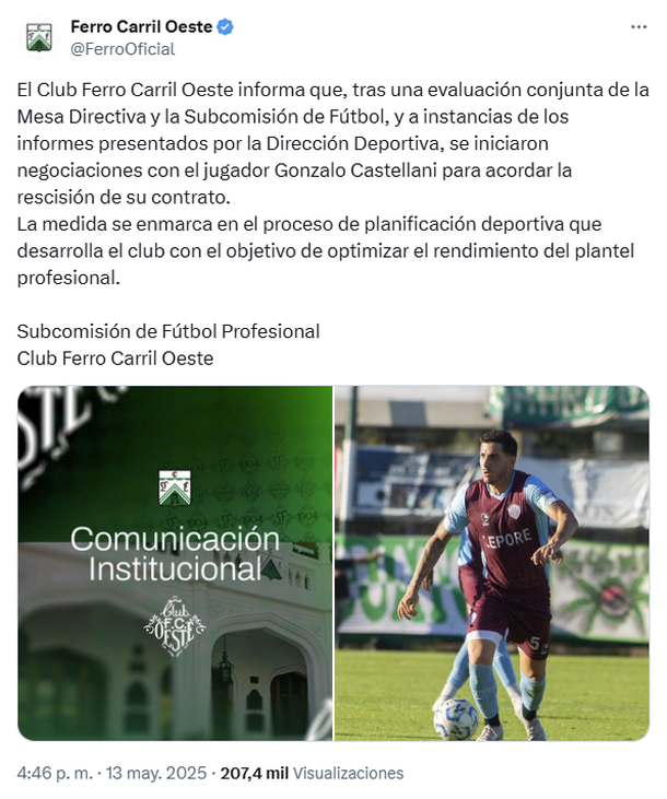 Ante la magnitud del escándalo, Ferro salió nuevamente a aclarar la situación con otro comunicado oficial: «Desde el Club Ferro Carril Oeste queremos destacar tal como lo hicimos ayer en el comunicado publicado en nuestras redes sociales oficiales que la rescisión del contrato de Gonzalo Castellani se debió a cuestiones estrictamente deportivas y profesionales«.