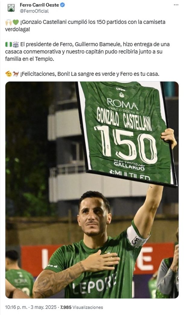 “¡Gonzalo Castellani cumplió los 150 partidos con la camiseta verdolaga! El presidente de Ferro, Guillermo Bameule, hizo entrega de una casaca conmemorativa y nuestro capitán pudo recibirla junto a su familia en el Templo. ¡Felicitaciones, Boni! La sangre es verde y Ferro es tu casa”, habían publicado desde el club en esa oportunidad junto a una foto del jugador sosteniendo la placa.
