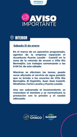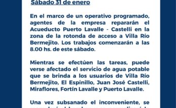 Los trabajos están previstos para el sábado 31 de enero, con inicio a partir de las 08:00 horas. Durante el desarrollo de las tareas, podría verse afectado el servicio de agua potable que se brinda a los usuarios de Villa Río Bermejito, El Espinillo, Juan José Castelli, Miraflores, Fortín Lavalle y Puerto Lavalle.