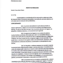 En la última sesión del Concejo Deliberante de la Municipalidad de Juan José Castelli, el concejal del Bloque Chaco Crece, perteneciente al Partido Justicialista, Franco Tiberio, presentó un proyecto de su autoría destinado a abordar la preocupante escalada en las tarifas del servicio de suministro eléctrico.