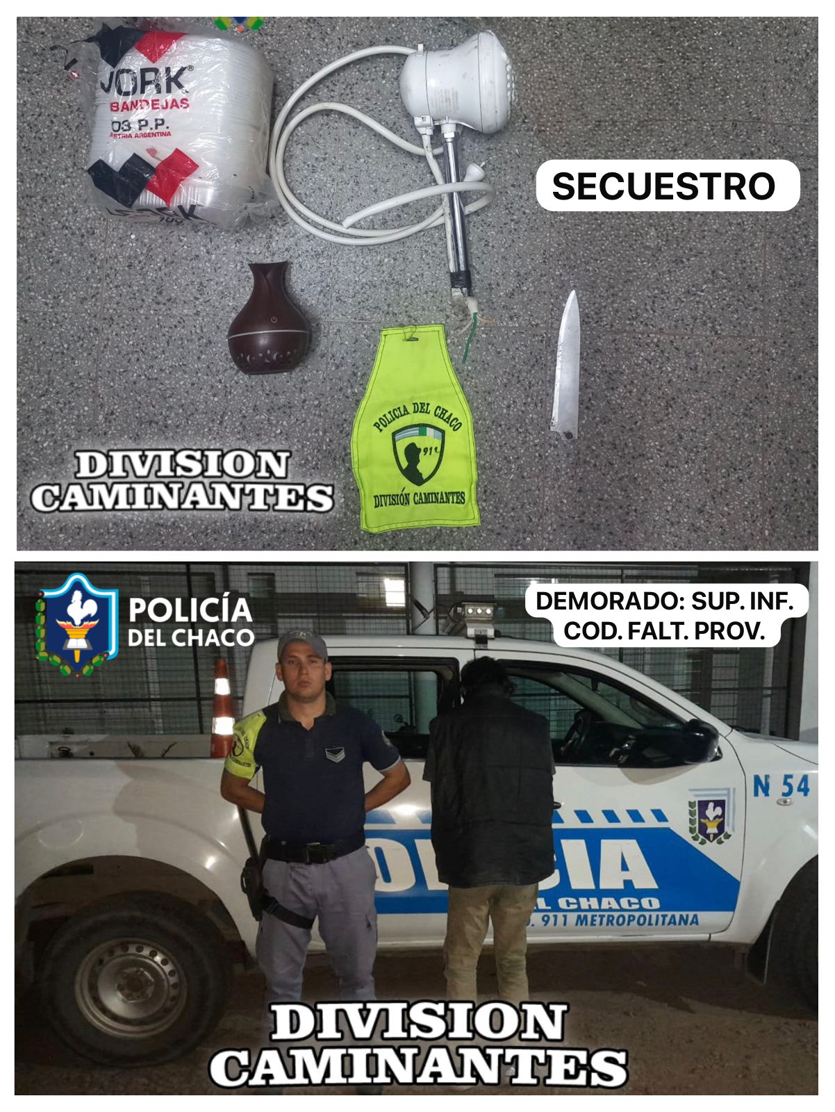 Al llegar, demoraron al implicado que arrojaba elementos a los vehículos que pasaban y gritaba a las personas de las paradas de colectivos, incitando a pelear a los agentes mostrando en todo momento una actitud hostil. Por ello, lo condujeron a la división Medicina Legal y luego a la dependencia policial. Procedieron al secuestro de una ducha eléctrica, un difusor aromático, una hoja de cuchillo y bandejas descartables para investigar si fueron obtenidas de forma ilícita.