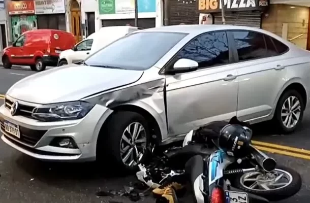 Como consecuencia de la temeraria maniobra del automovilista, el hombre que viajaba en la moto impactó contra la parte delantera izquierda del Volkswagen y salió despedido.