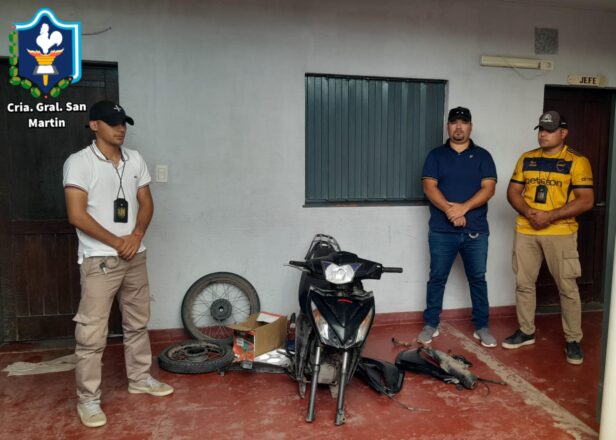 A partir de esta información y de datos aportados por informantes, los agentes realizaron un rastrillaje en una zona boscosa cercana al río de Oro. Allí encontraron la motocicleta buscada, oculta entre las malezas, junto a partes del carenado del mismo rodado.